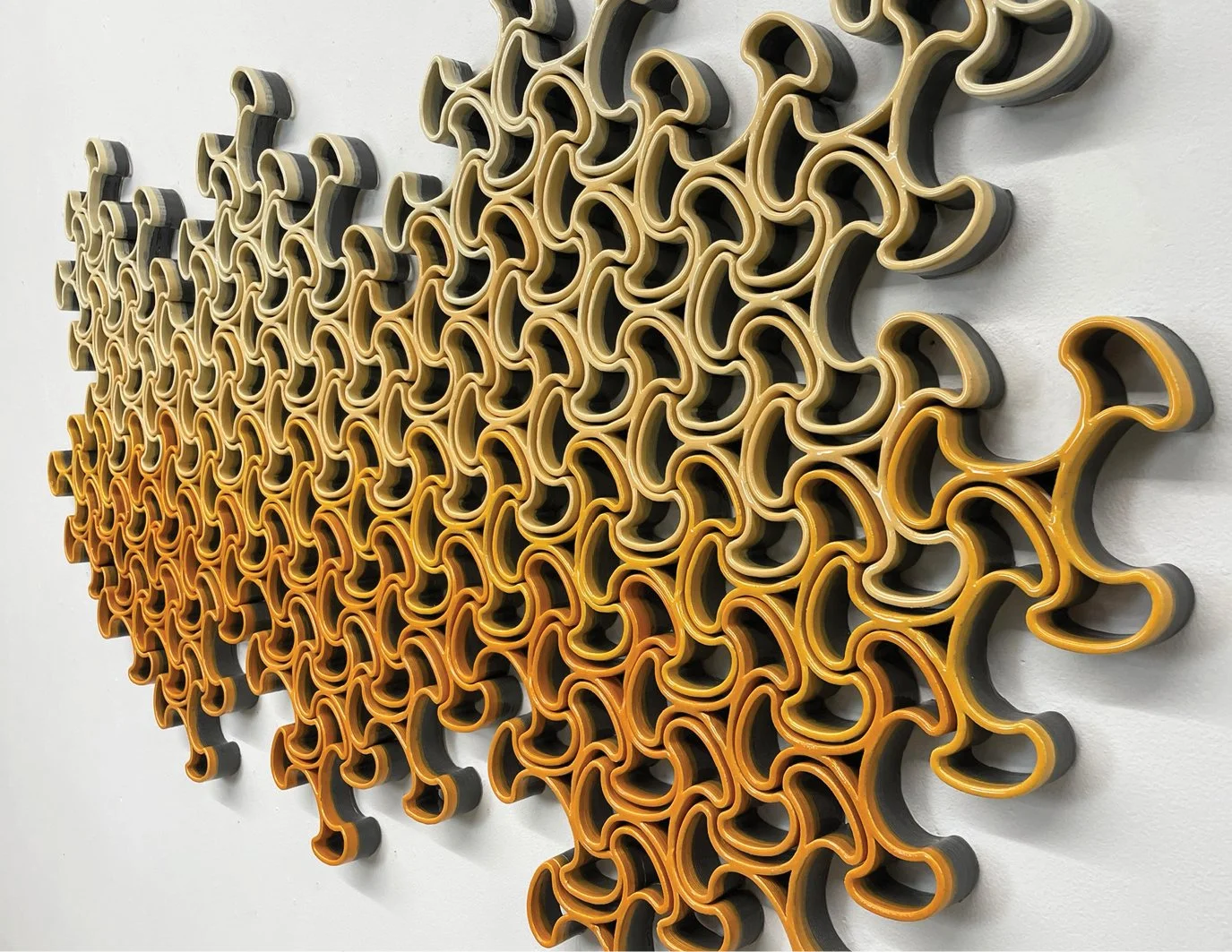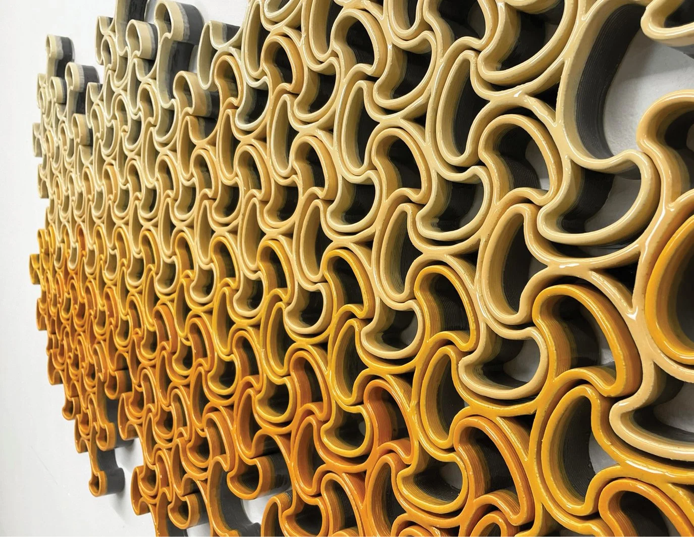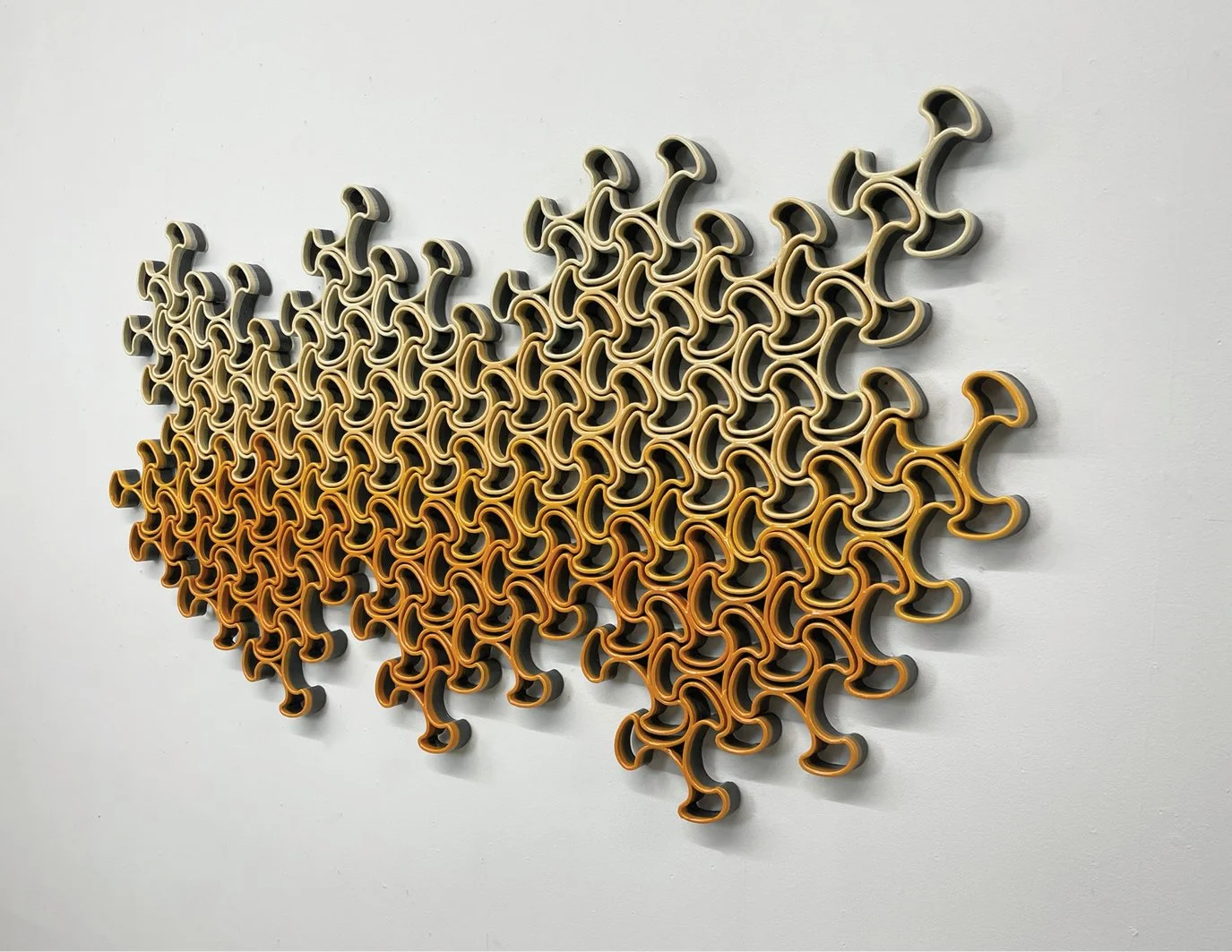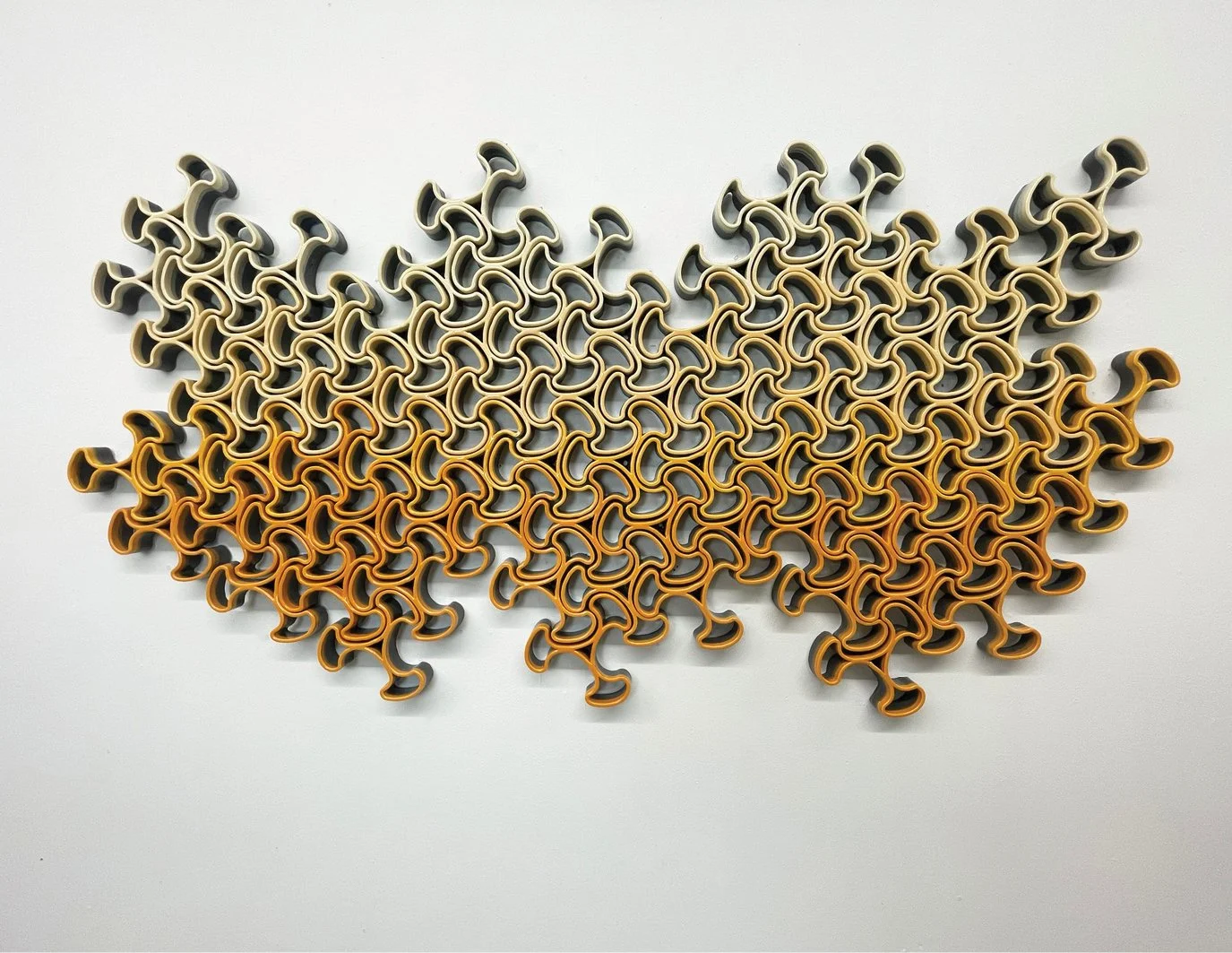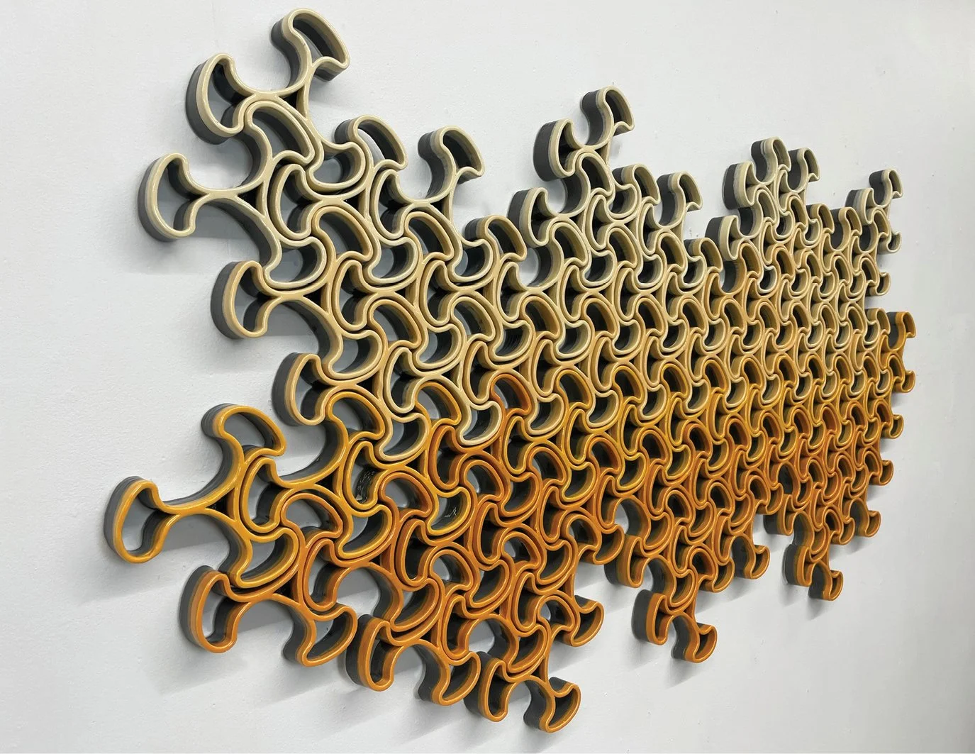 Pattern, rhythm, light/shadow, and interdependence are explored in the Collective series. This series explores wall-mounted sculptures consisting of independent interlocking ceramic units. The artwork begins with the installation of a single unit on the wall. The piece then begins to grow with the addition of units that link to the one installed, ultimately resulting in a large work that relies on a set of anchored units to maintain the position of the collective.