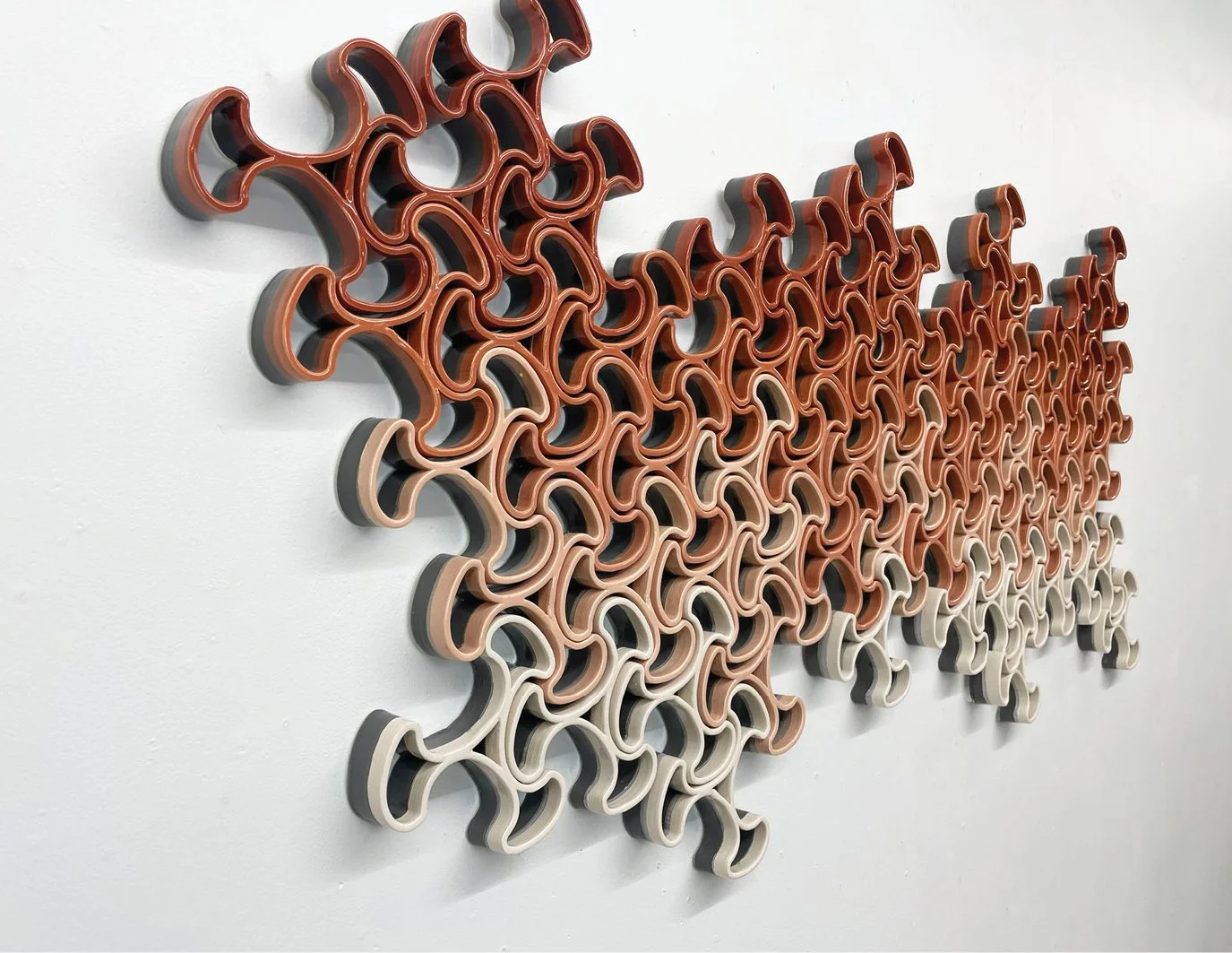 Pattern, rhythm, light/shadow, and interdependence are explored in the Collective series. This series explores wall-mounted sculptures consisting of independent interlocking ceramic units. The artwork begins with the installation of a single unit on the wall. The piece then begins to grow with the addition of units that link to the one installed, ultimately resulting in a large work that relies on a set of anchored units to maintain the position of the collective.