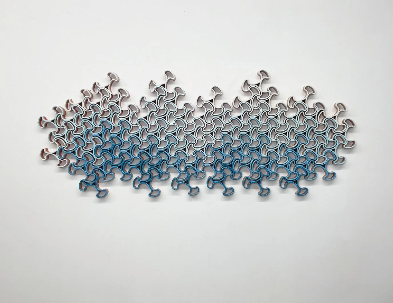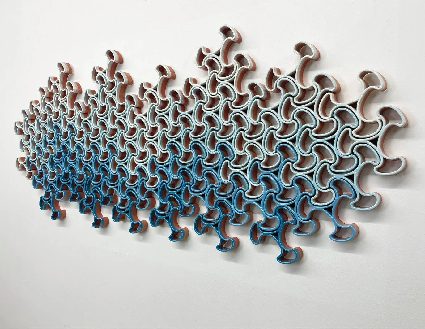 Pattern, rhythm, light/shadow, and interdependence are explored in the Collective series. This series explores wall-mounted sculptures consisting of independent interlocking ceramic units. The artwork begins with the installation of a single unit on the wall. The piece then begins to grow with the addition of units that link to the one installed, ultimately resulting in a large work that relies on a set of anchored units to maintain the position of the collective.
